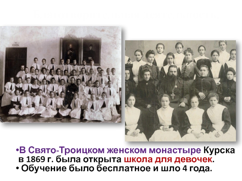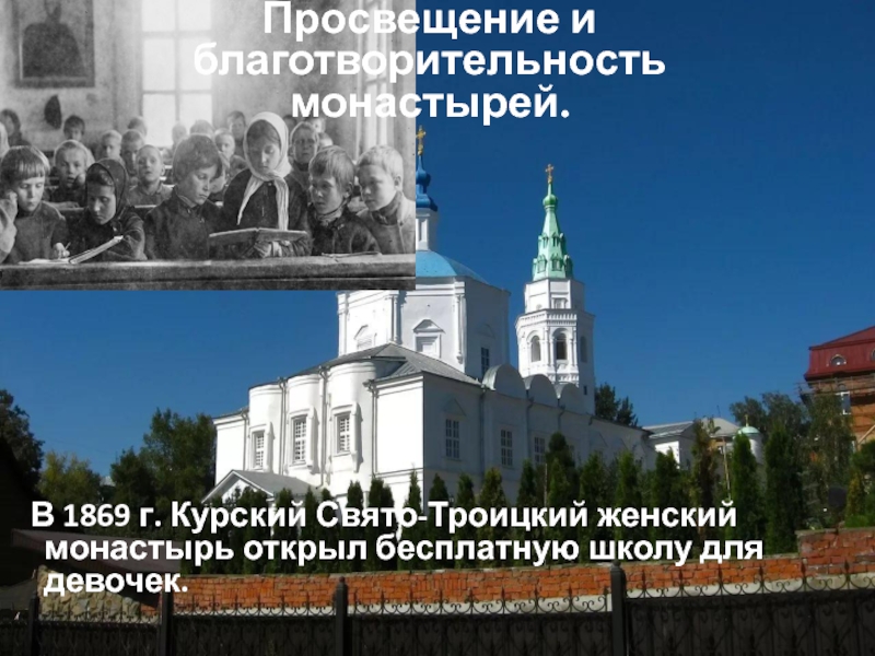 Слайд 31В 1869 г. Курский Свято-Троицкий женский монастырь открыл бесплатную школу для