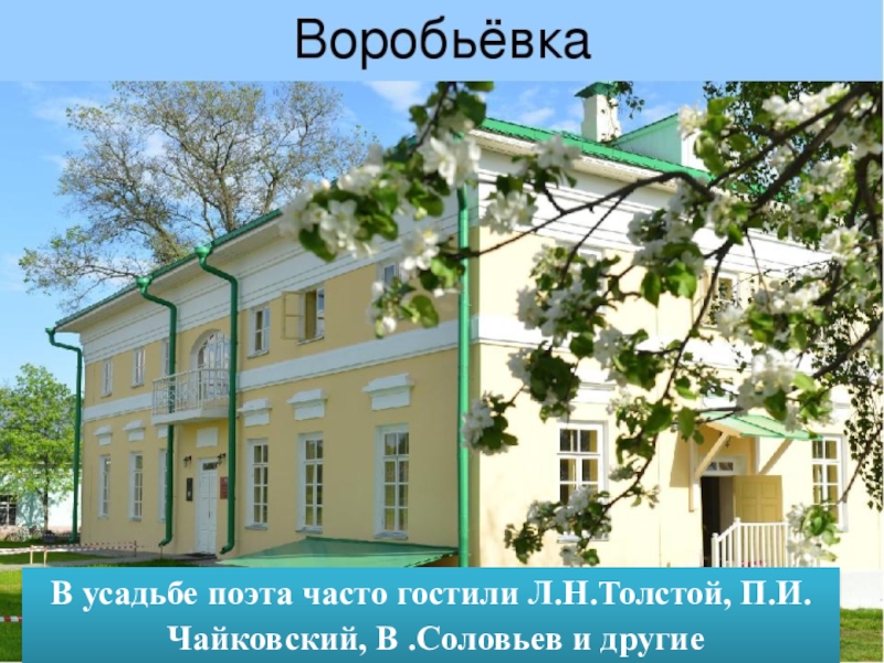 Слайд 12В усадьбе поэта часто гостили Л.Н.Толстой, П.И.Чайковский, В .Соловьев и другие