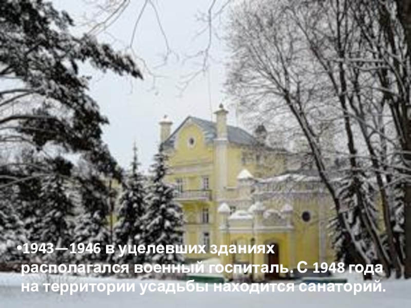 Слайд 161943—1946 в уцелевших зданиях располагался военный госпиталь. С 1948 года на