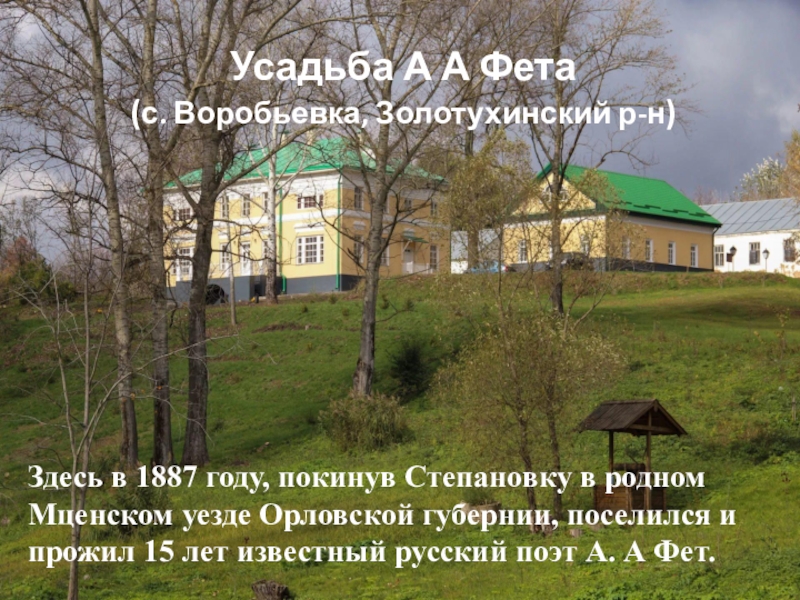 покинув Степановку в родном Мценском уезде Орловской губернии, поселился и прожил 15 лет известный русский поэт А. А Фет.
