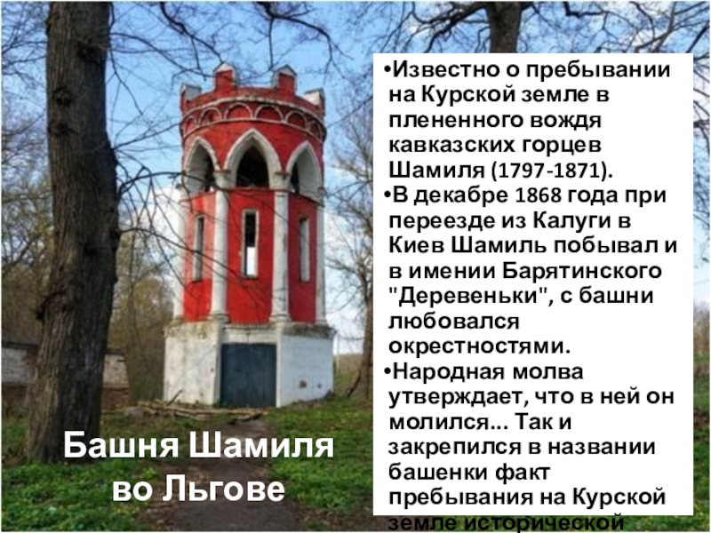 В декабре 1868 года при переезде из Калуги в Киев Шамиль побывал и в имении Барятинского "Деревеньки", с башни любовался окрестностями.