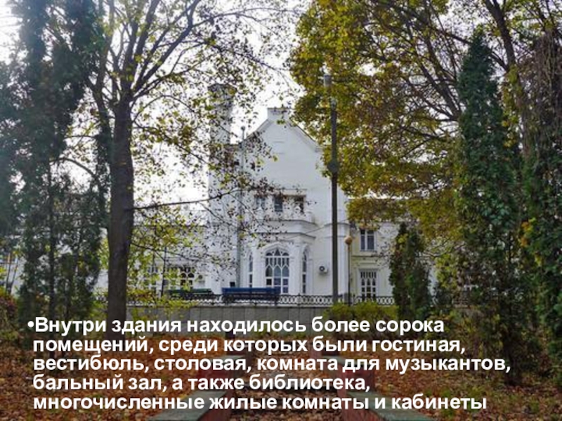 Слайд 14Внутри здания находилось более сорока помещений, среди которых были гостиная, вестибюль,