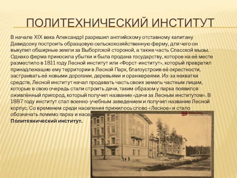 образцовую сельскохозяйственную ферму, для чего он выкупил обширные земли за Выборгской стороной, а также часть Спасской мызы. Однако ферма приносила убытки и была продана государству, которое на её месте разместило в 1811 году Лесной институт или «Форст-институт», который превратил принадлежащие ему территории в Лесной Парк, благоустроив её окрестности, застраивать её новыми дорогами, деревьями и оранжереями. Из-за нехватки средств, Лесной институт начал продавать часть своих земель частным лицам, которые в свою очередь стали строить дачи, таким образом у парка появился оживлённый пригород, который получил название «дачи за Лесным институтом». В 1887 году институт стал военно-учебным заведением и получил название Лесной корпус. Со временем среди населения прижилось слово «Лесное» и стало обозначать помимо парка и населённый пункт. В начале XX века здесь был открыт Политехнический институт.
