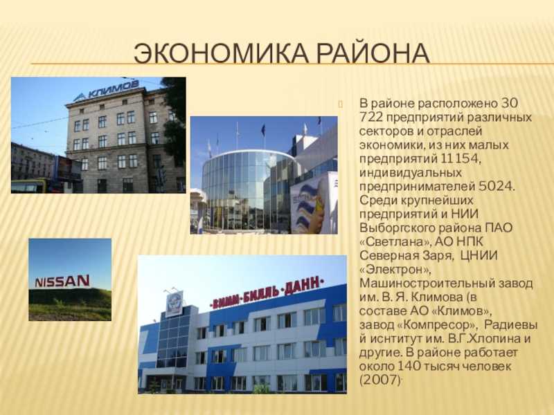 экономики, из них малых предприятий 11 154, индивидуальных предпринимателей 5024. Среди крупнейших предприятий и НИИ Выборгского района ПАО «Светлана», АО НПК Северная Заря, ЦНИИ «Электрон», Машиностроительный завод им. В. Я. Климова (в составе АО «Климов», завод «Компресор», Радиевый иснтитут им. В.Г.Хлопина и другие. В районе работает около 140 тысяч человек (2007).
