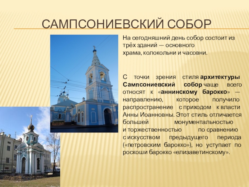 точки зрения стиля архитектуры Сампсониевский собор чаще всего относят к «аннинскому барокко» — направлению, которое получило распространение с приходом к власти Анны Иоанновны. Этот стиль отличается большей монументальностью и торжественностью по сравнению с искусством предыдущего периода («петровским барокко»), но уступает по роскоши барокко «елизаветинскому».
