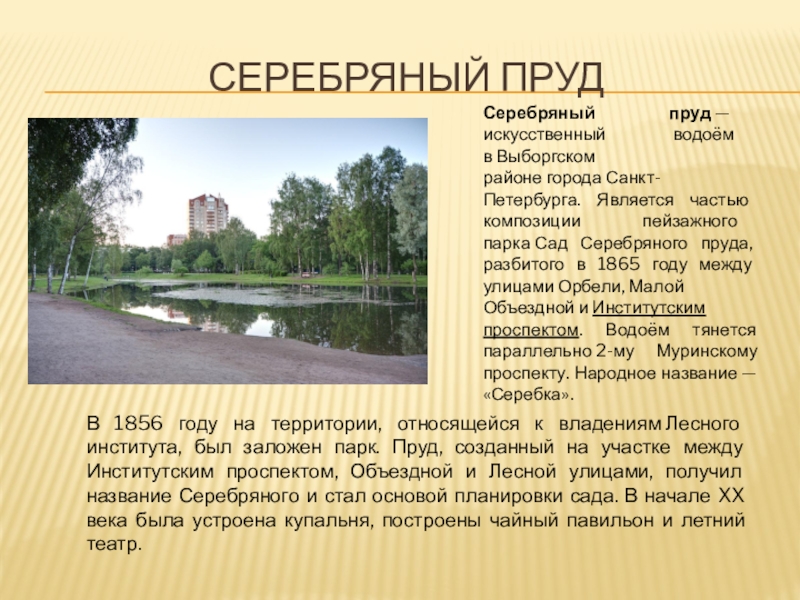 парка Сад Серебряного пруда, разбитого в 1865 году между улицами Орбели, Малой Объездной и Институтским проспектом. Водоём тянется параллельно 2-му Муринскому проспекту. Народное название — «Серебка».