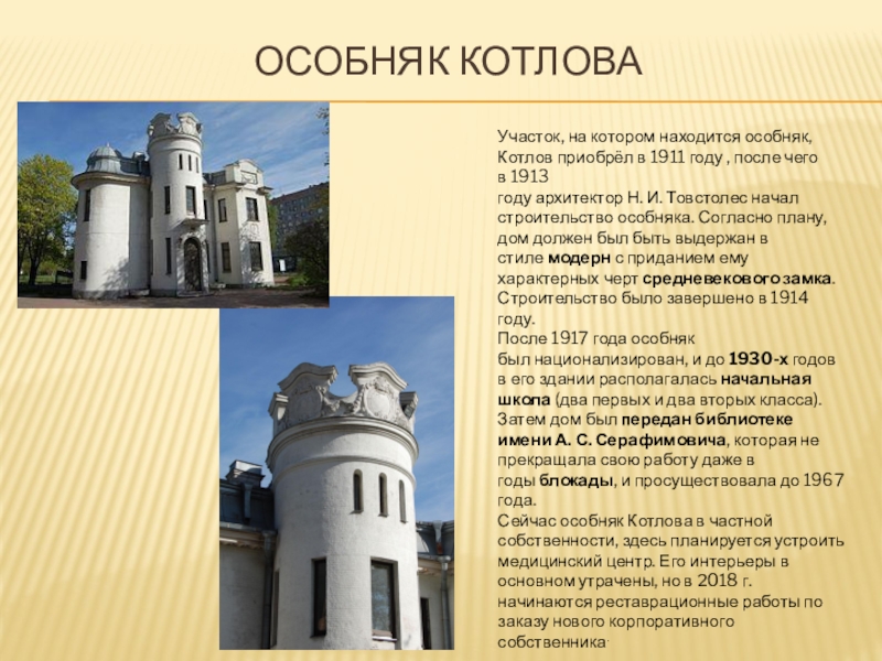 Участок, на котором находится особняк, Котлов приобрёл в 1911 году ,