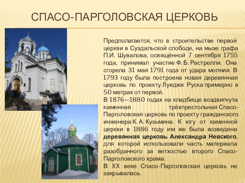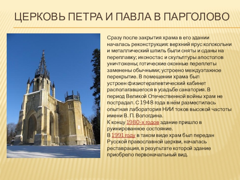 Слайд 17Це́рковь святы́х первоверхо́вных апо́столов Петра́ и Па́вла — действующий православный храм в Шуваловском