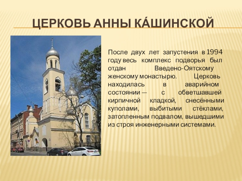 отдан Введено-Оятскому женскому монастырю. Церковь находилась в аварийном состоянии — с обветшавшей кирпичной кладкой, снесёнными куполами, выбитыми стёклами, затопленным подвалом, вышедшими из строя инженерными системами.
