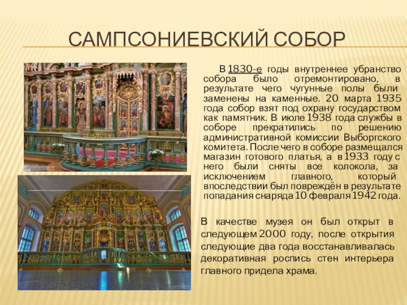 в результате чего чугунные полы были заменены на каменные. 20 марта 1935 года собор взят под охрану государством как памятник. В июле 1938 года службы в соборе прекратились по решению административной комиссии Выборгского комитета. После чего в соборе размещался магазин готового платья, а в 1933 году с него были сняты все колокола, за исключением главного, который впоследствии был повреждён в результате попадания снаряда 10 февраля 1942 года.