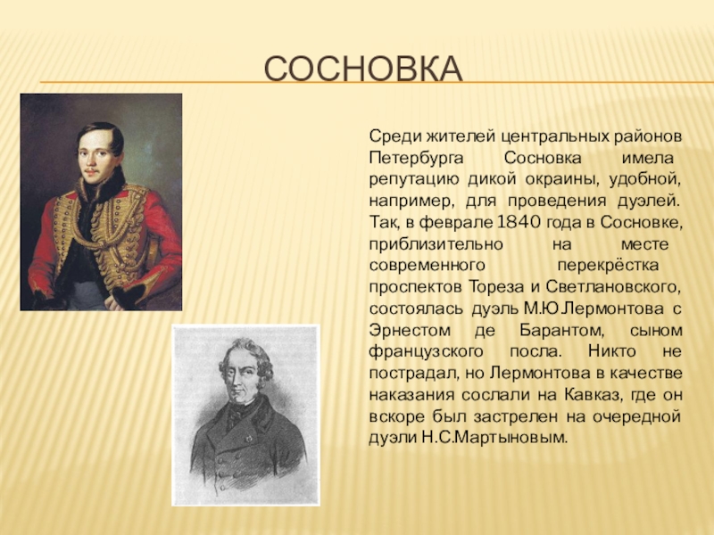 например, для проведения дуэлей. Так, в феврале 1840 года в Сосновке, приблизительно на месте современного перекрёстка проспектов Тореза и Светлановского, состоялась дуэль М.Ю.Лермонтова с Эрнестом де Барантом, сыном французского посла. Никто не пострадал, но Лермонтова в качестве наказания сослали на Кавказ, где он вскоре был застрелен на очередной дуэли Н.С.Мартыновым.