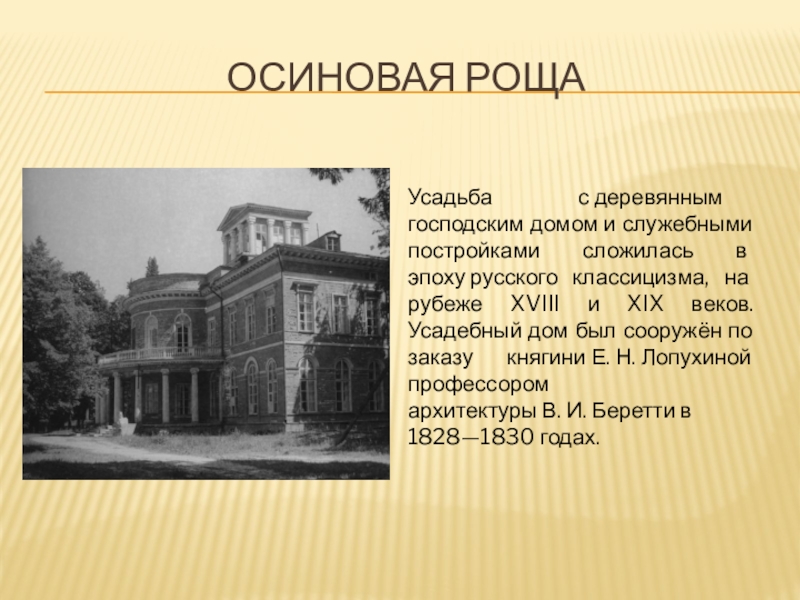 сторонники продолжения либеральных преобразований. Последним частным владельцем Осиновой Рощи был князь Б. Л. Вяземский.