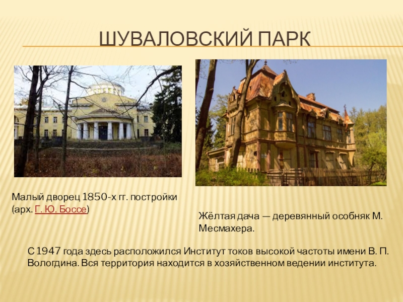 1947 года здесь расположился Институт токов высокой частоты имени В. П. Вологдина. Вся территория находится в хозяйственном ведении института.