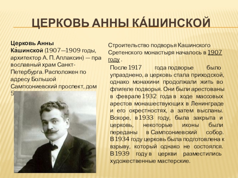 Церковь Анны Ка́шинской (1907—1909 годы, архитектор А. П. Аплаксин) — православный храм Санкт-Петербурга. Расположен по адресу Большой Сампсониевский проспект, дом 53