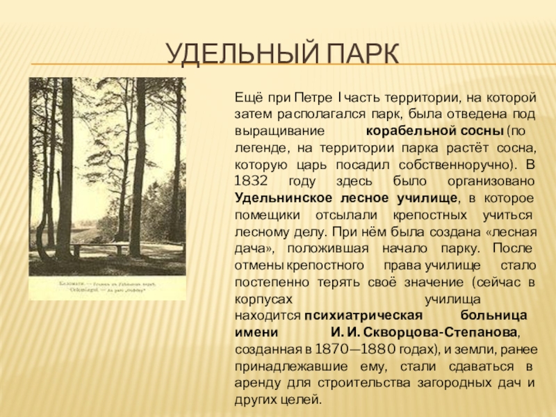 отведена под выращивание корабельной сосны (по легенде, на территории парка растёт сосна, которую царь посадил собственноручно). В 1832 году здесь было организовано Удельнинское лесное училище, в которое помещики отсылали крепостных учиться лесному делу. При нём была создана «лесная дача», положившая начало парку. После отмены крепостного права училище стало постепенно терять своё значение (сейчас в корпусах училища находится психиатрическая больница имени И. И. Скворцова-Степанова, созданная в 1870—1880 годах), и земли, ранее принадлежавшие ему, стали сдаваться в аренду для строительства загородных дач и других целей.