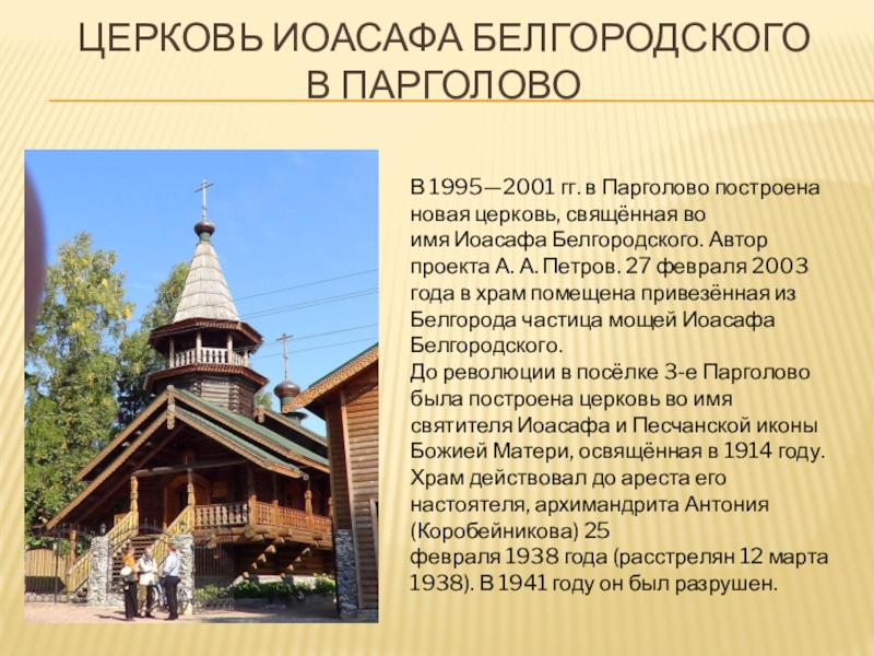 свящённая во имя Иоасафа Белгородского. Автор проекта А. А. Петров. 27 февраля 2003 года в храм помещена привезённая из Белгорода частица мощей Иоасафа Белгородского.