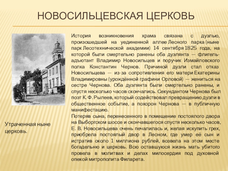 парка (ныне парк Лесотехнической академии) 14 сентября 1825 года, на которой были смертельно ранены оба дуэлянта — флигель-адъютант Владимир Новосильцев и поручик Измайловского полка Константин Чернов. Причиной дуэли стал отказ Новосильцева — из-за сопротивления его матери Екатерины Владимировны (урождённой графини Орловой) — жениться на сестре Чернова. Оба дуэлянта были смертельно ранены, и спустя несколько часов скончались. Секундантом Чернова был поэт К. Ф. Рылеев, который содействовал превращению дуэли в общественное событие, а похорон Чернова — в публичную манифестацию.