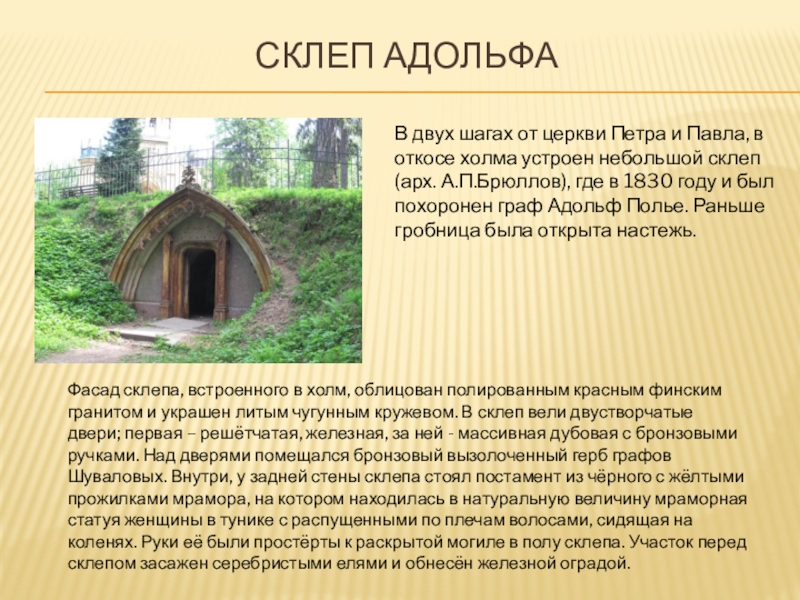 холма устроен небольшой склеп (арх. А.П.Брюллов), где в 1830 году и был похоронен граф Адольф Полье. Раньше гробница была открыта настежь.