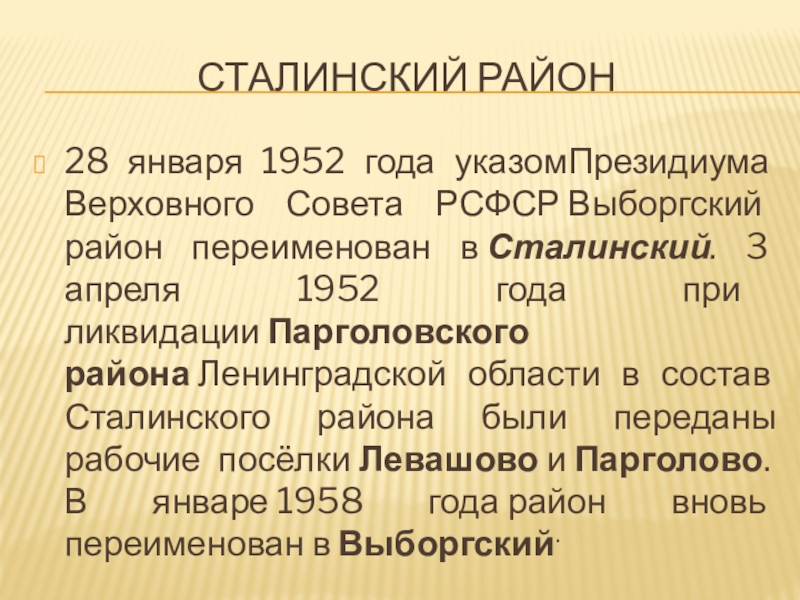 в Сталинский. 3 апреля 1952 года при ликвидации Парголовского района Ленинградской области в состав Сталинского района были переданы рабочие посёлки Левашово и Парголово. В январе 1958 года район вновь переименован в Выборгский.