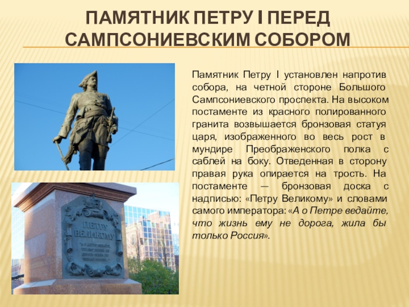 Слайд 35Памятник Петру I перед Сампсониевским собором
