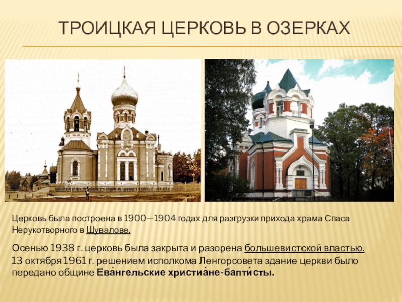 13 октября 1961 г. решением исполкома Ленгорсовета здание церкви было передано общине Ева́нгельские христиа́не-бапти́сты.
