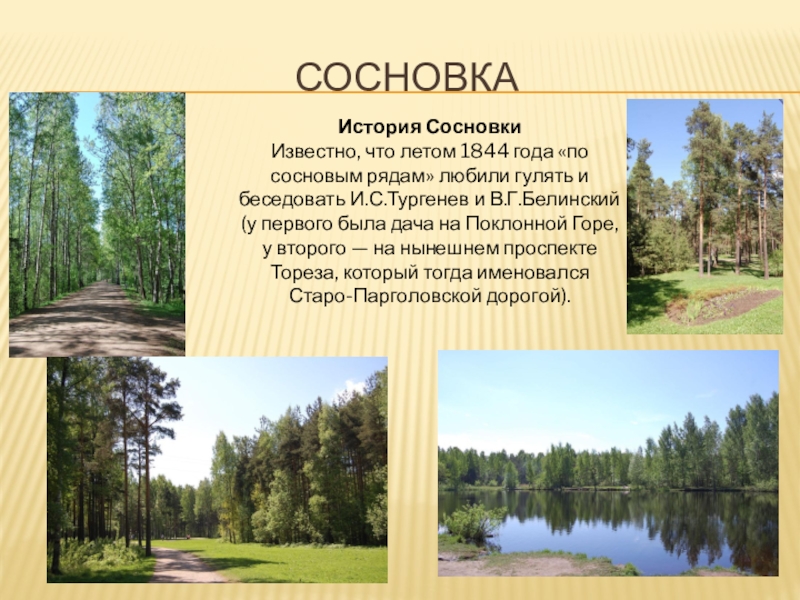 и беседовать И.С.Тургенев и В.Г.Белинский (у первого была дача на Поклонной Горе, у второго — на нынешнем проспекте Тореза, который тогда именовался Старо-Парголовской дорогой).