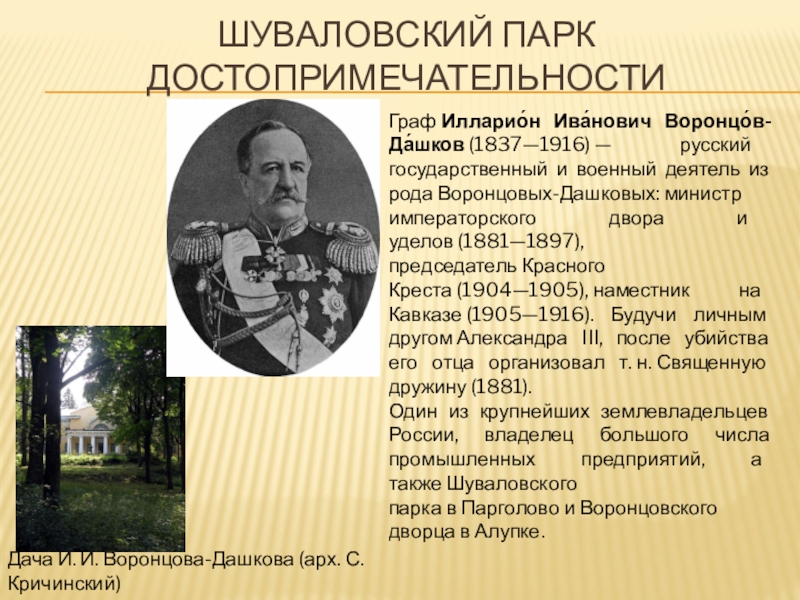 Один из крупнейших землевладельцев России, владелец большого числа промышленных предприятий, а также Шуваловского парка в Парголово и Воронцовского дворца в Алупке.