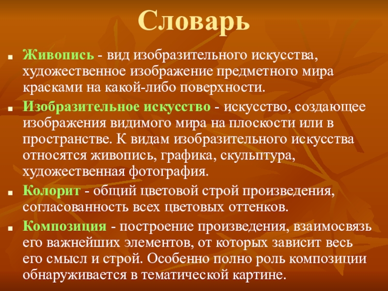 Композиция - построение произведения, взаимосвязь его важнейших элементов, от которых зависит весь его смысл и строй. Особенно полно роль композиции обнаруживается в тематической картине.
