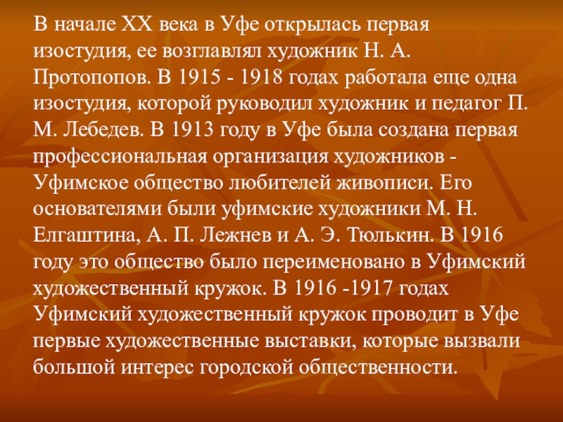 ее возглавлял художник Н. А. Протопопов. В 1915 - 1918 годах работала еще одна изостудия, которой руководил художник и педагог П. М. Лебедев. В 1913 году в Уфе была создана первая профессиональная организация художников - Уфимское общество любителей живописи. Его основателями были уфимские художники М. Н. Елгаштина, А. П. Лежнев и А. Э. Тюлькин. В 1916 году это общество было переименовано в Уфимский художественный кружок. В 1916 -1917 годах Уфимский художественный кружок проводит в Уфе первые художественные выставки, которые вызвали большой интерес городской общественности.
