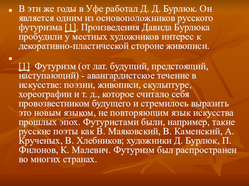 В эти же годы в Уфе работал Д. Д. Бурлюк. Он