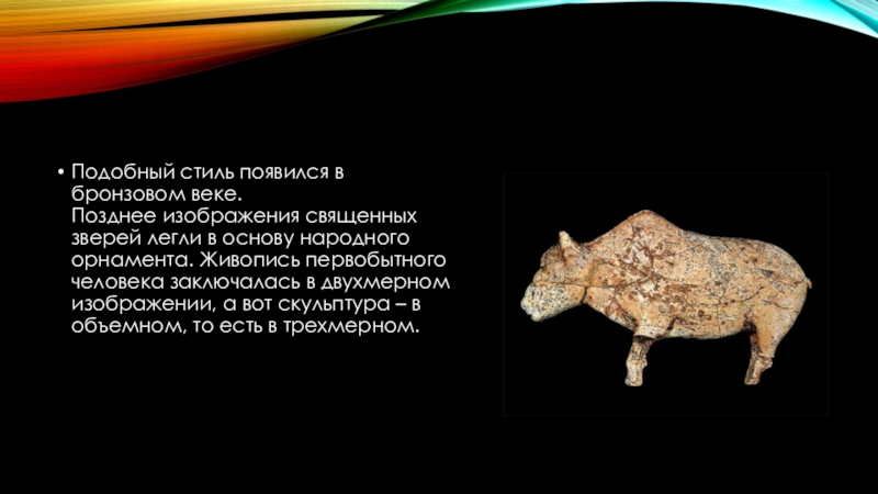 Подобный стиль появился в бронзовом веке. Позднее изображения священных зверей легли в основу народного орнамента. Живопись первобытного человека заключалась в двухмерном изображении,