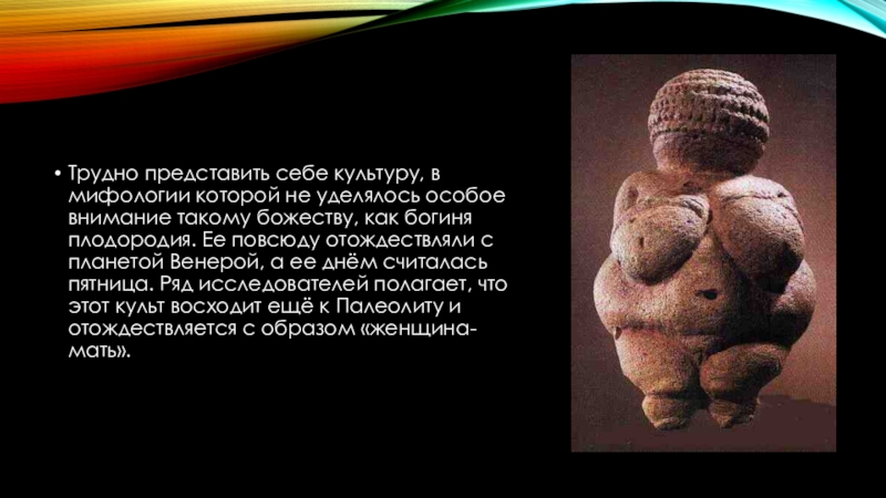 такому божеству, как богиня плодородия. Ее повсюду отождествляли с планетой Венерой, а ее днём считалась пятница. Ряд исследователей полагает, что этот культ восходит ещё к Палеолиту и отождествляется с образом «женщина-мать».