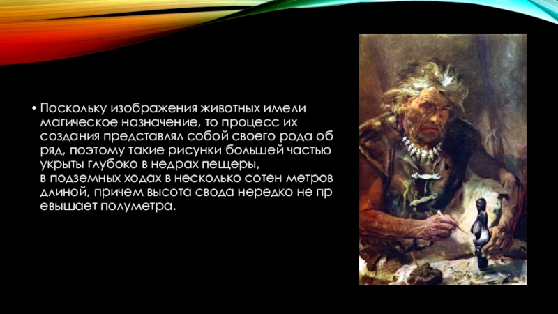 Слайд 8Поскольку изображения животных имели магическое назначение, то процесс их          создания представлял собой своего рода обряд, поэтому такие рисунки большей частьюукрыты глубоко в недрах пещеры, в подземных ходах в несколько сотен метровдлиной, причем высота свода нередко не превышает полуметра.