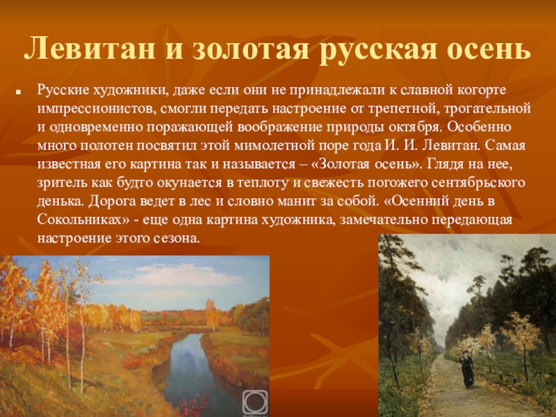 к славной когорте импрессионистов, смогли передать настроение от трепетной, трогательной и одновременно поражающей воображение природы октября. Особенно много полотен посвятил этой мимолетной поре года И. И. Левитан. Самая известная его картина так и называется – «Золотая осень». Глядя на нее, зритель как будто окунается в теплоту и свежесть погожего сентябрьского денька. Дорога ведет в лес и словно манит за собой. «Осенний день в Сокольниках» - еще одна картина художника, замечательно передающая настроение этого сезона.