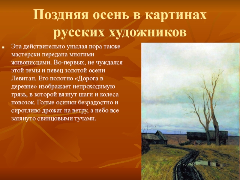 передана многими живописцами. Во-первых, не чуждался этой темы и певец золотой осени Левитан. Его полотно «Дорога в деревне» изображает непроходимую грязь, в которой вязнут шаги и колеса повозок. Голые осинки безрадостно и сиротливо дрожат на ветру, а небо все затянуто свинцовыми тучами.