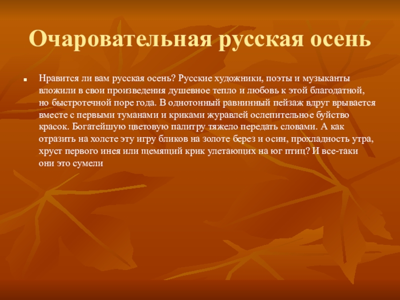 Очаровательная русская осеньНравится ли вам русская осень? Русские художники, поэты и музыканты вложили в свои произведения душевное тепло и любовь к этой благодатной, но быстротечной поре года. В однотонный равнинный пейзаж вдруг врывается вместе с первыми