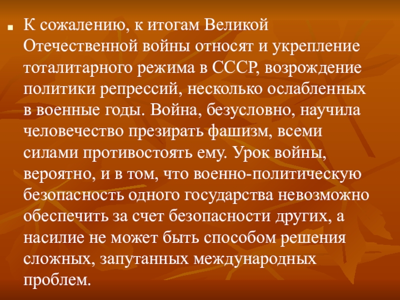 Слайд 94К сожалению, к итогам Великой Отечественной войны относят и укрепление тоталитарного