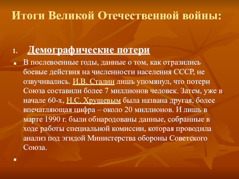 отразились боевые действия на численности населения СССР, не озвучивались. И.В. Сталин лишь упомянул, что потери Союза составили более 7 миллионов человек. Затем, уже в начале 60-х, Н.С. Хрущевым была названа другая, более впечатляющая цифра – около 20 миллионов. И лишь в марте 1990 г. были обнародованы данные, собранные в ходе работы специальной комиссии, которая проводила анализ под эгидой Министерства обороны Советского Союза.