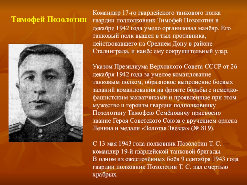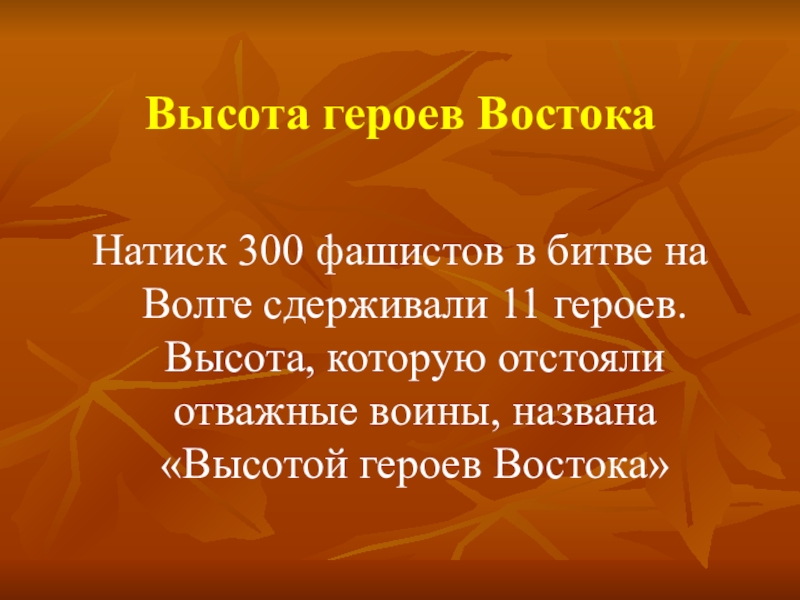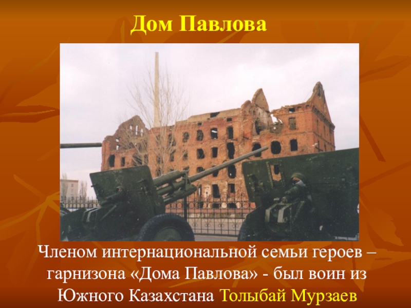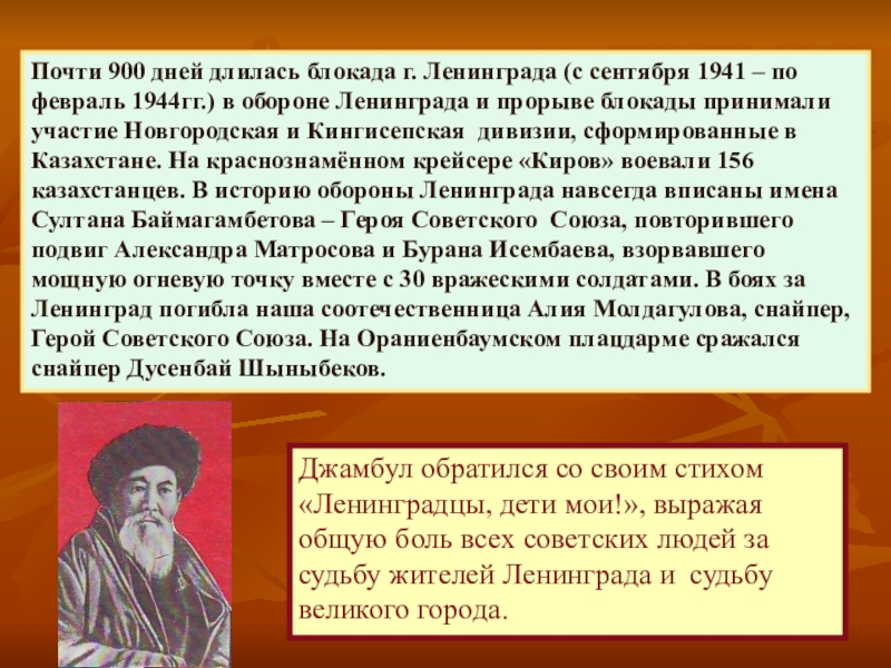 по февраль 1944гг.) в обороне Ленинграда и прорыве блокады принимали участие Новгородская и Кингисепская дивизии, сформированные в Казахстане. На краснознамённом крейсере «Киров» воевали 156 казахстанцев. В историю обороны Ленинграда навсегда вписаны имена Султана Баймагамбетова – Героя Советского Союза, повторившего подвиг Александра Матросова и Бурана Исембаева, взорвавшего мощную огневую точку вместе с 30 вражескими солдатами. В боях за Ленинград погибла наша соотечественница Алия Молдагулова, снайпер, Герой Советского Союза. На Ораниенбаумском плацдарме сражался снайпер Дусенбай Шыныбеков.