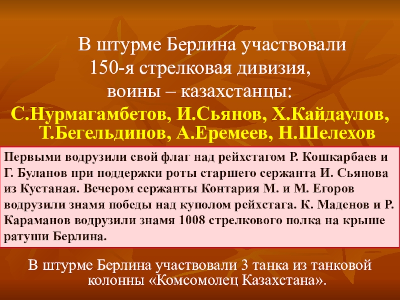 В штурме Берлина участвовали 3 танка из танковой колонны «Комсомолец Казахстана».
