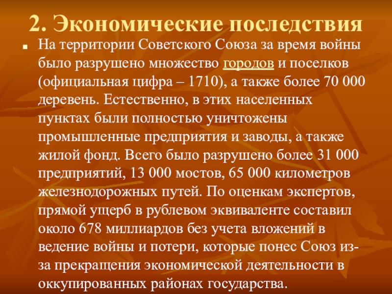 множество городов и поселков (официальная цифра – 1710), а также более 70 000 деревень. Естественно, в этих населенных пунктах были полностью уничтожены промышленные предприятия и заводы, а также жилой фонд. Всего было разрушено более 31 000 предприятий, 13 000 мостов, 65 000 километров железнодорожных путей. По оценкам экспертов, прямой ущерб в рублевом эквиваленте составил около 678 миллиардов без учета вложений в ведение войны и потери, которые понес Союз из-за прекращения экономической деятельности в оккупированных районах государства.