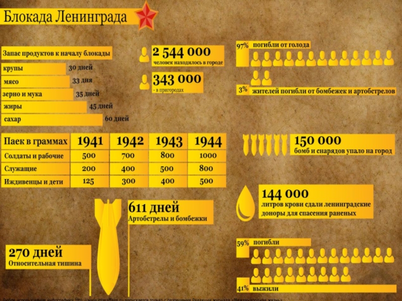 Слайд 33Почти 900 дней длилась блокада г. Ленинграда (с сентября 1941 –