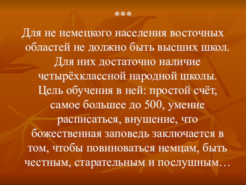 школ. Для них достаточно наличие четырёхклассной народной школы. Цель обучения в ней: простой счёт, самое большее до 500, умение расписаться, внушение, что божественная заповедь заключается в том, чтобы повиноваться немцам, быть честным, старательным и послушным…