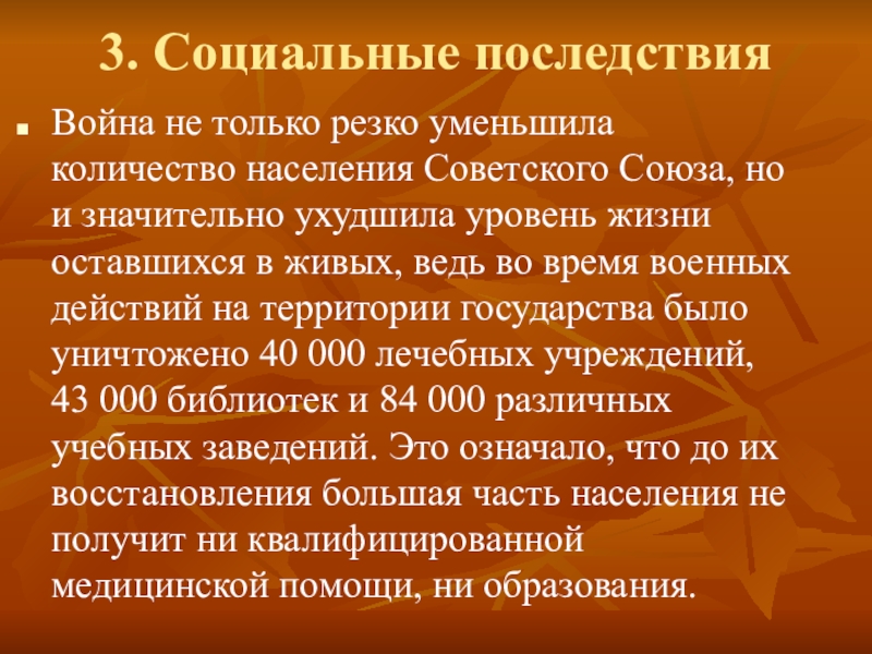 но и значительно ухудшила уровень жизни оставшихся в живых, ведь во время военных действий на территории государства было уничтожено 40 000 лечебных учреждений, 43 000 библиотек и 84 000 различных учебных заведений. Это означало, что до их восстановления большая часть населения не получит ни квалифицированной медицинской помощи, ни образования.