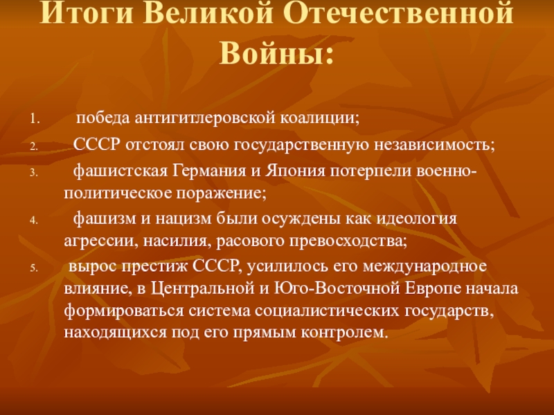 вырос престиж СССР, усилилось его международное влияние, в Центральной и Юго-Восточной Европе начала формироваться система социалистических государств, находящихся под его прямым контролем.