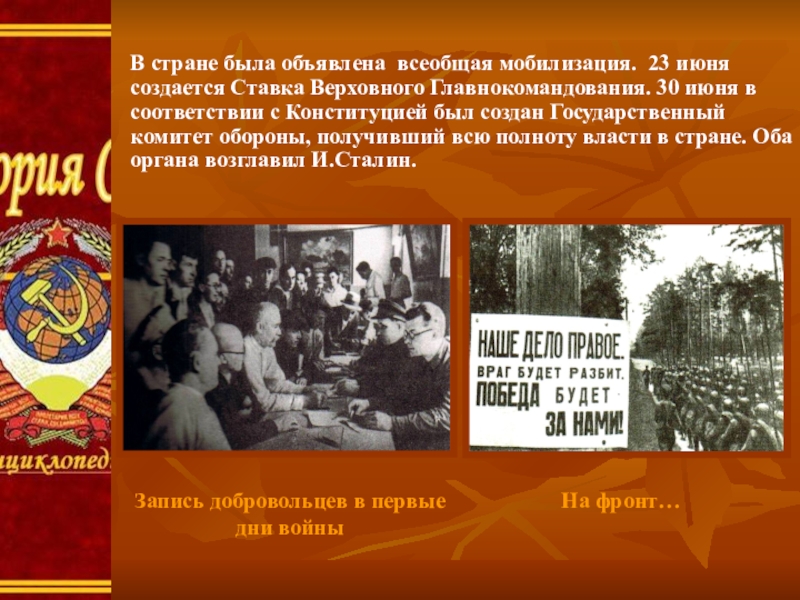 Слайд 24В стране была объявлена всеобщая мобилизация. 23 июня создается Ставка Верховного