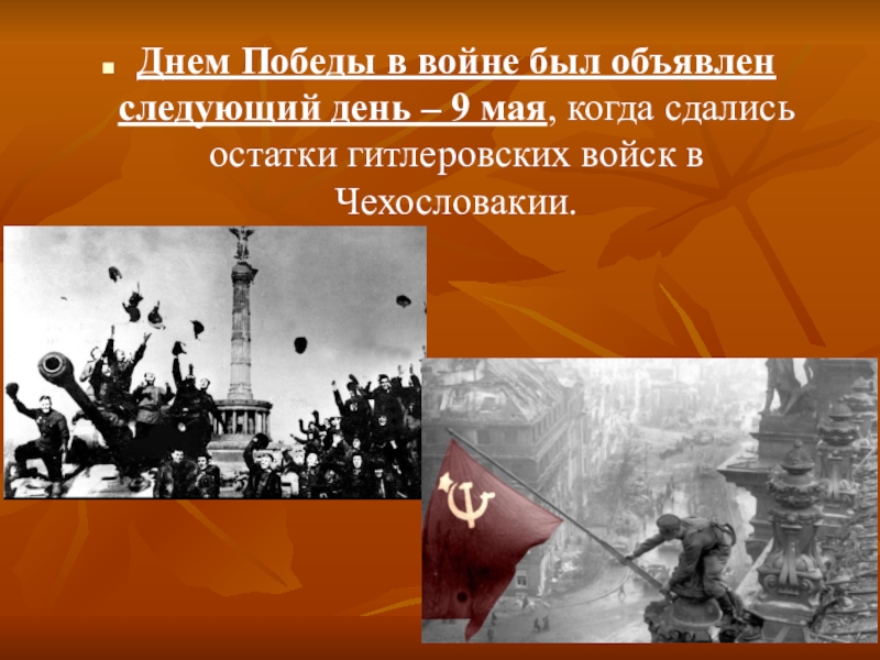 Слайд 81Днем Победы в войне был объявлен следующий день – 9 мая,