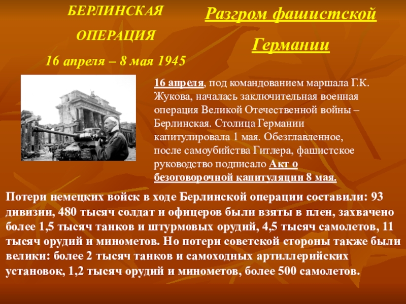 ходе Берлинской операции составили: 93 дивизии, 480 тысяч солдат и офицеров были взяты в плен, захвачено более 1,5 тысяч танков и штурмовых орудий, 4,5 тысяч самолетов, 11 тысяч орудий и минометов. Но потери советской стороны также были велики: более 2 тысяч танков и самоходных артиллерийских установок, 1,2 тысяч орудий и минометов, более 500 самолетов.