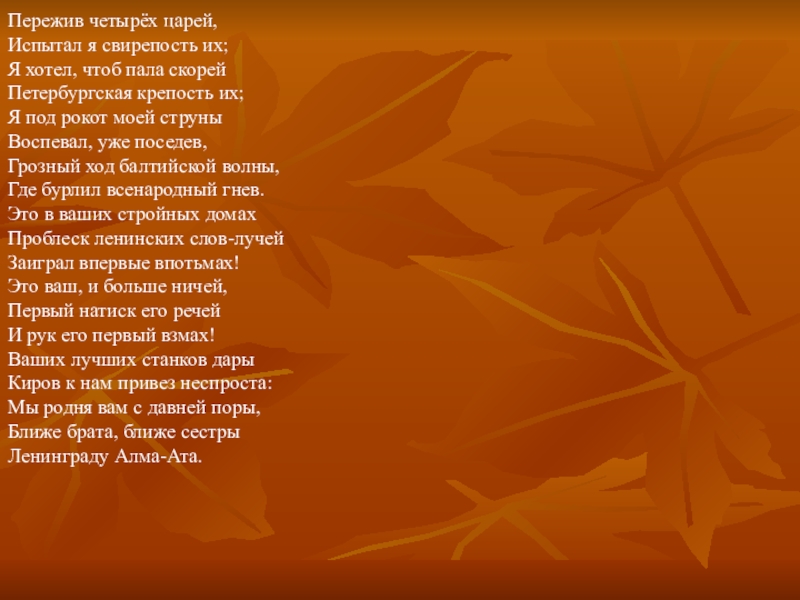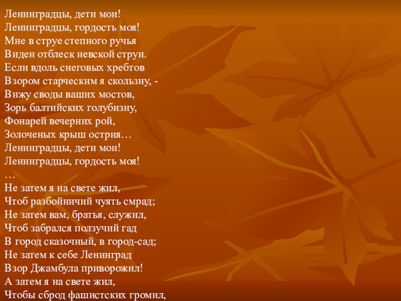 Джамбул обратился со своим стихом «Ленинградцы, дети мои!», выражая общую боль всех советских людей за судьбу жителей Ленинграда и судьбу великого города.
