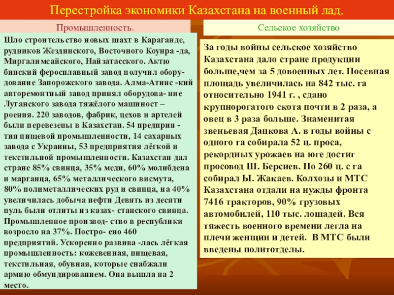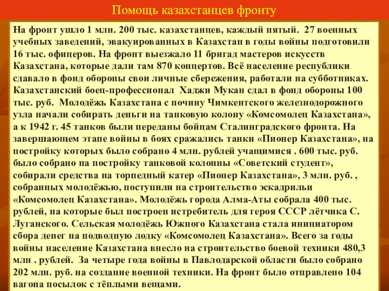 пятый. 27 военных учебных заведений, эвакуированных в Казахстан в годы войны подготовили 16 тыс. офицеров. На фронт выезжало 11 бригад мастеров искусств Казахстана, которые дали там 870 концертов. Всё население республики сдавало в фонд обороны свои личные сбережения, работали на субботниках. Казахстанский боец-профессионал Хаджи Мукан сдал в фонд обороны 100 тыс. руб. Молодёжь Казахстана с почину Чимкентского железнодорожного узла начали собирать деньги на танковую колону «Комсомолец Казахстана», а к 1942 г. 45 танков были переданы бойцам Сталинградского фронта. На завершающем этапе войны в боях сражались танки «Пионер Казахстана», на постройку которых было собрано 4 млн. рублей учащимися . 600 тыс. руб. было собрано на постройку танковой колонны «Советский студент», собирали средства на торпедный катер «Пионер Казахстана», 3 млн. руб. , собранных молодёжью, поступили на строительство эскадрильи «Комсомолец Казахстана». Молодёжь города Алма-Аты собрала 400 тыс. рублей, на которые был построен истребитель для героя СССР лётчика С. Луганского. Сельская молодёжь Южного Казахстана стала инициатором сбора денег на подводную лодку «Комсомолец Казахстана». Всего за годы войны население Казахстана внесло на строительство боевой техники 480,3 млн . рублей. За четыре года войны в Павлодарской области было собрано 202 млн. руб. на создание военной техники. На фронт было отправлено 104 вагона посылок с тёплыми вещами.